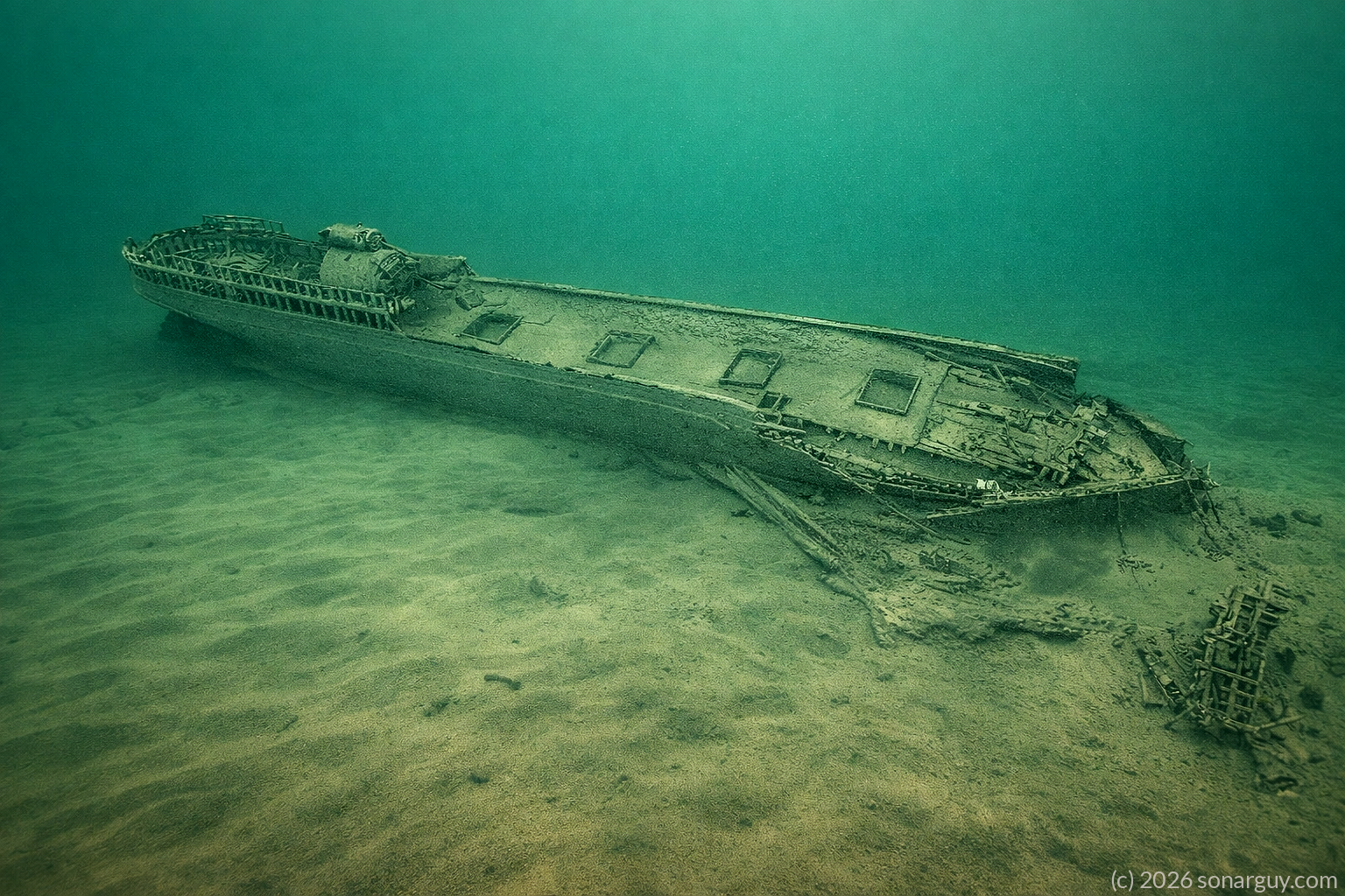On August 22, 2020, we found this steamer that we believed to be the T.J. Waffle over twenty miles off Oswego. Well we proved ourselves to be wrong when on June 2, 2024 we found another steamer that was actually the T.J. Waffle. This one seems to have also had an explosion on her decks or perhaps it was tossed around like a rag doll in a violent storm, it’s hard to say. It does appear to have had a violent end by the looks of the wreck site. We now call this the Mystery wreck because we just don't know which steamer it is at this point. More