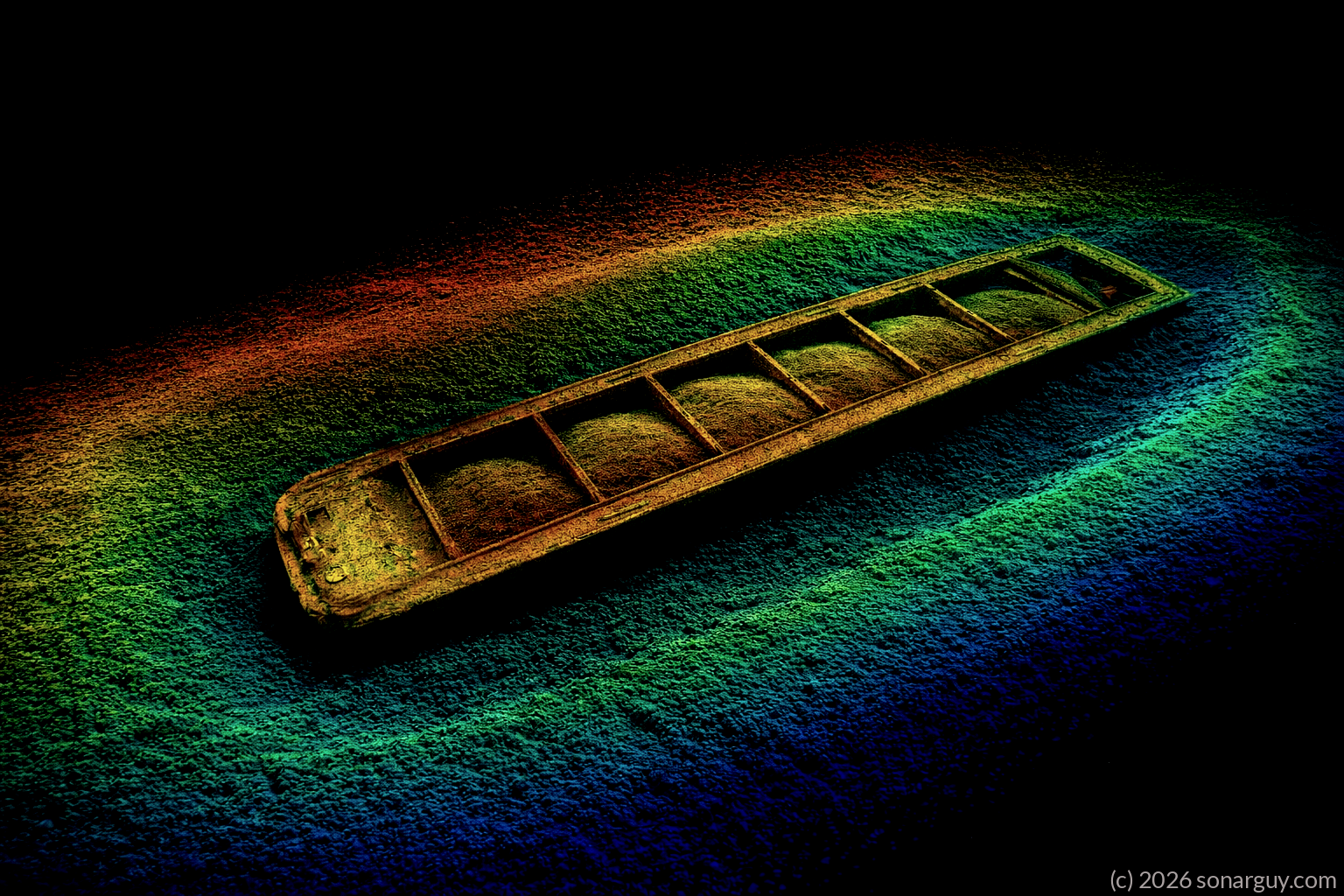 We did this 3-D image of this small boat on our last run of the season on December 8 of 2023. This old boat is on the bottom of Oneida Lake in 40 feet of water.